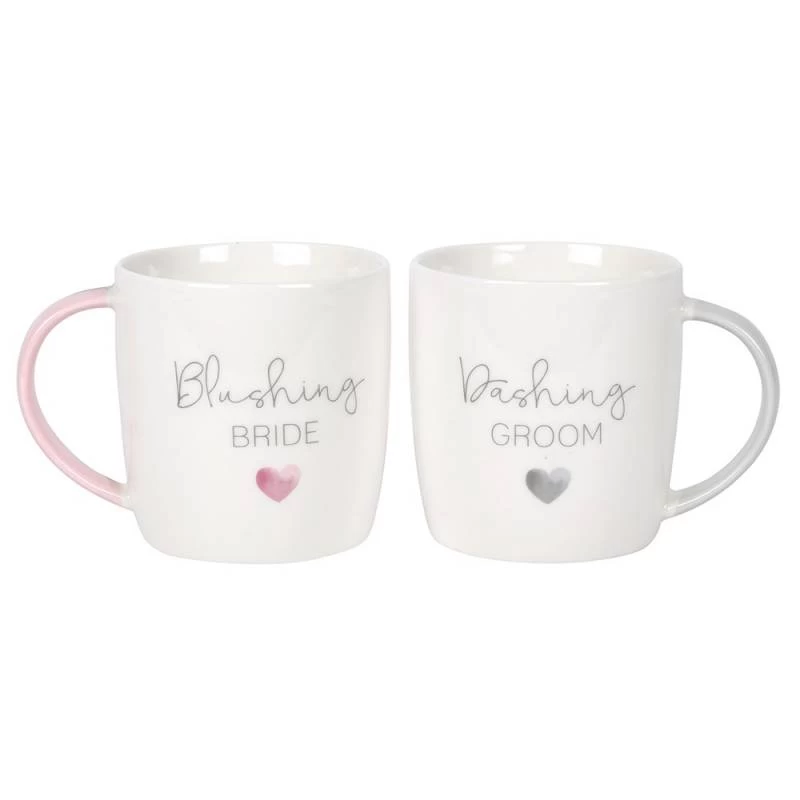 Presented in a gift box this pair of mugs say the words Blushing Bride on one and Dashing Groom on the other.