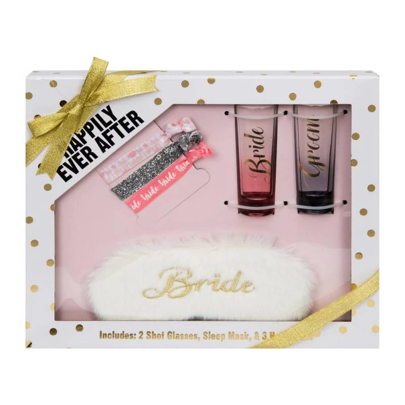 Inside the gift box you will find a Bride sleep mask, a pair of bride and groom shot glasses, and three pretty hair bands.