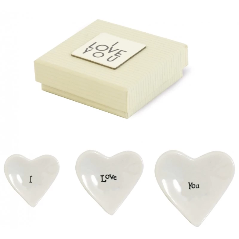 Inside the 5.5cm x 5.5cm I Love You desugn box you will find three tiny dishes with the words I Love You on. The dishes can be used as keepsakes or to store things like earrings on.
