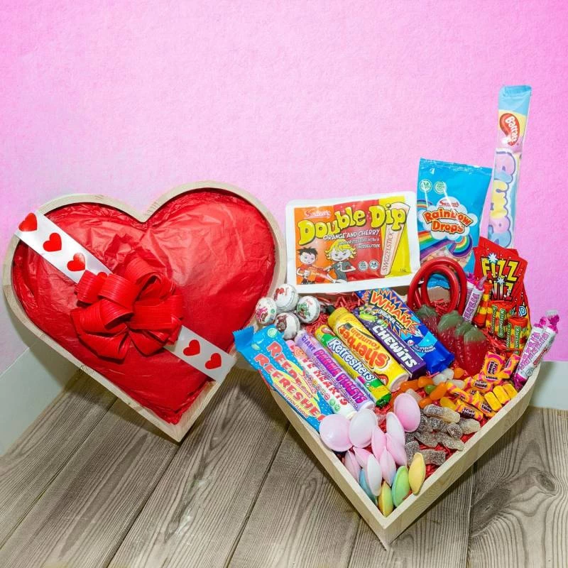 The solid wooden heart tray is filled to the brim with all the well known classics and makes a truly beautiful gift.