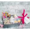 There is a beautiful bottle of Bottega Pink Prosecco, two stunning bath bombs, a cello bag of love sweets, a box of chocolate hearts, a pink Yankee Candle jar and some Joe and Sephs Strawberry cheesecake popcorn.