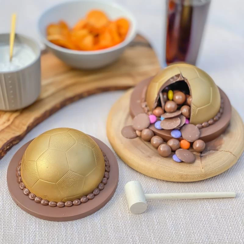 Each Gold Smash Football is made from a deliciously creamy Belgian Milk Chocolate shell, filled to the brim with Maltesers®, Cadbury’s Chocolate Buttons® and Smarties®. The football is then set on a thick plaque made from even more Belgian milk chocolate!
