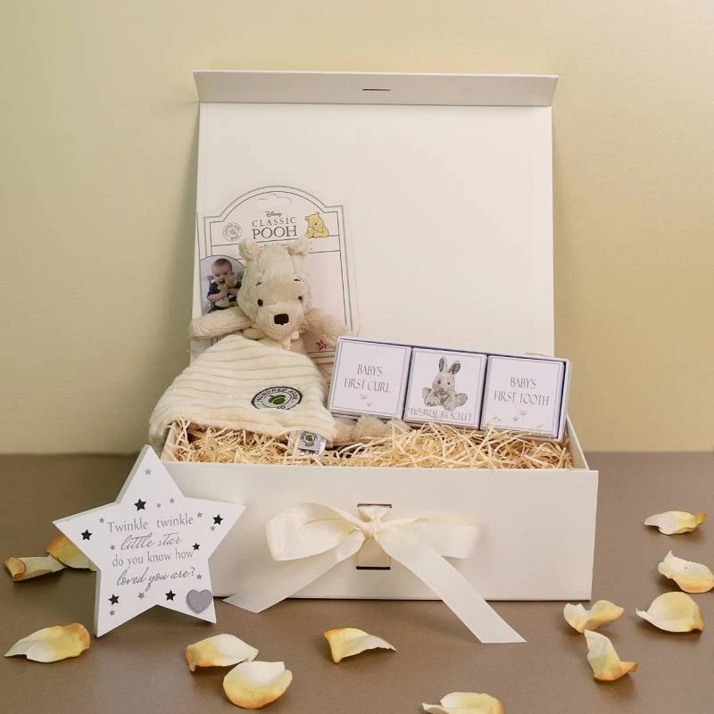 The ideal gift to welcome the new baby girl into this world. Our New Baby Gift Box contains a stunning collection of treats and gifts for baby and parents.
