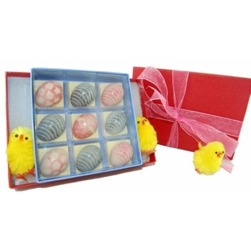 The Nine Chocolate Eggs Gift includes nine solid hand made Belgian Chocolate eggs mounted on white chocolate squares.