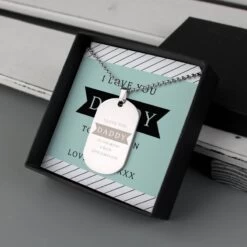 Personalise this Dog Tag and Sentiments card with 5 lines, lines 1, 3, 4 and 5 are message lines up to 18 characters per line. Line 2 has a character limit of 8 and is perfect for a role, such as Dad or Grandad.