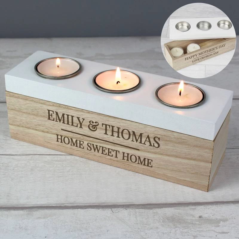 Get your home organised with the help of our Personalised Classic Tea Light Box! This wooden, shabby chic box can store a small amount of tea lights or trinkets. Three tea lights can be displayed on top of the box, creating a unique feature for any shelf or mantelpiece.