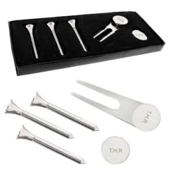 The golf set comprises of 3 tees, a pitch repairer and a ball marker with interchangeable disc which can be engraved with up to 3 initials and 3 full stops.