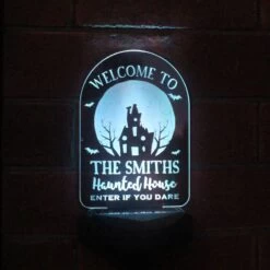 The light can be personalised with your names or family name, up to 15 characters in between the fixed text ‘Welcome to’ & ‘Haunted House, enter if you dare’.
