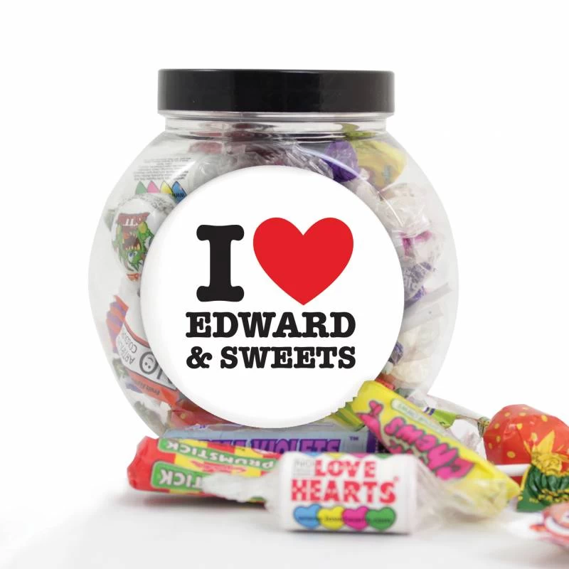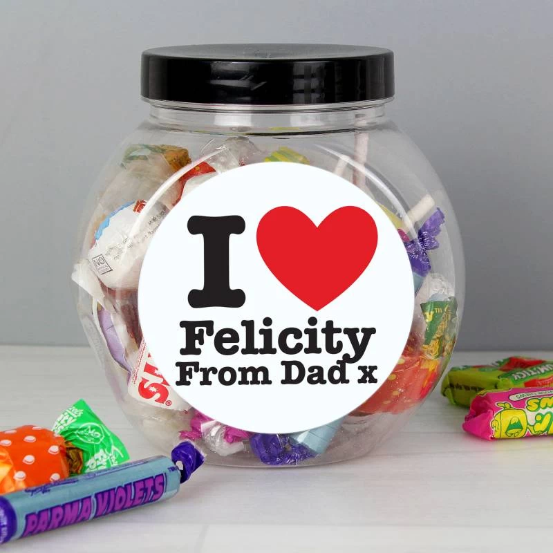 Personalise this I HEART Sweet Jar with any name or message over two lines of 12 characters each.