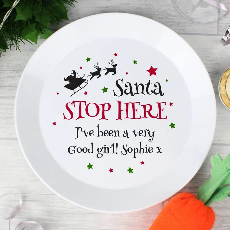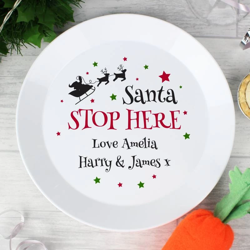 Leave Santa and Rudolph a tasty treat on Christmas Eve with this fantastic personalised Santa Stop Here Plastic Plate.