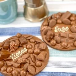 This Chocolate Hug is made from a slab of Belgian milk chocolate, packed to the brim with chocolatey treats: Maltesers, Cadbury Chocolate Buttons, KitKat, Cadbury Dairy Milk, Celebrations and chocolate crispy coated fudge.