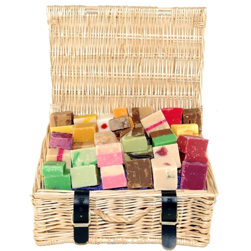 The hand made wicker hamper is filled to the brim with a selection of 17 different flavours of fudge from our Funky Fudge range. The flavours may vary but will include a selection of 17 of the following flavours.