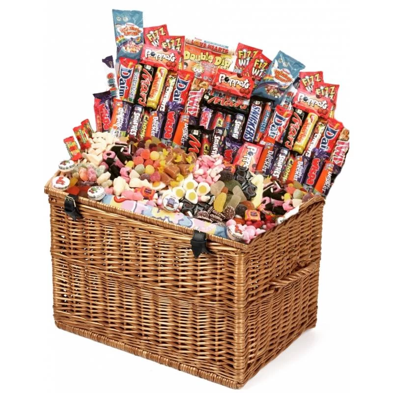 The absolutely huge wicker hamper is filled to the brim with a massive selection of our retro sweets and chocolate bars. The ideal gift for a massive office or a huge family, it contains so many sweets it is hard to fit them all on this page but you are looking at over 250 portions of sweets and chocolate bars.