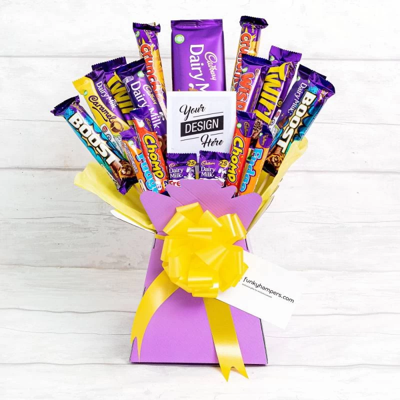 Our exclusive PicBouquet is the ideal way to make one of our amazing gifts truly personal. Upload a photo or company logo, add some text and your design will be added inside the bouquet so when they open the gift, not only are they treated to an amazing selection of treats inside, they also see your custom greeting.
