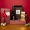 There is a box of chocolate love hearts, a bag of jelly bean love hearts, a bag of love heart sweets and a 200ml bottle of sparkling Rose.